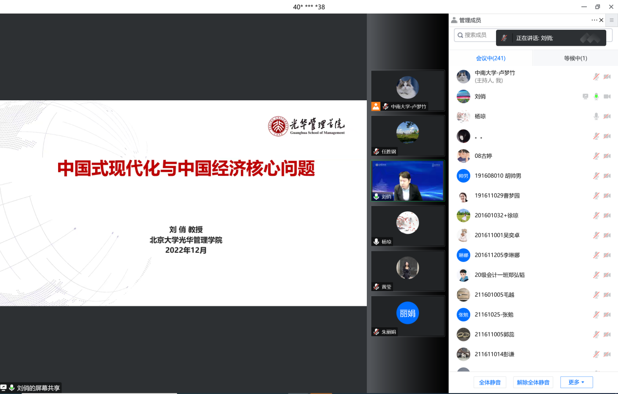 2022年12月19日上午10:00,北京大学光华管理学院院长刘俏教授应邀做客星空XKXK星空体育40周年院庆名家大讲堂,在线为星空官网师生带来了题为《中国式现代化和中国经济核心问题》的讲座。讲座由XK星空体育党委书记任胜钢教授担任主持,龚艳萍院长、危平副院长、周文辉教授等老师与各年级硕博士研究生共计300余人参加了本次讲座。