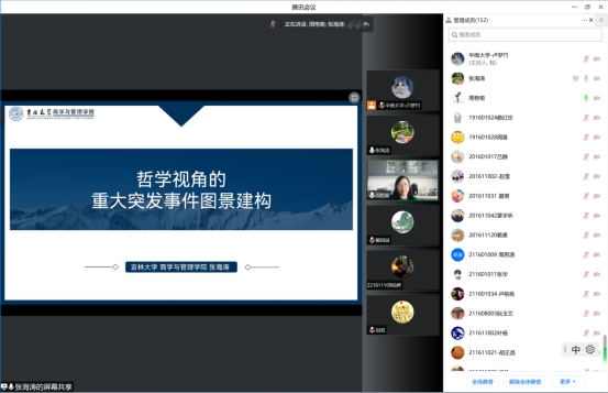 2023年3月10日上午10:00,吉林大学商学与管理学院张海涛教授应邀做客星空XKXK星空体育经管学术论坛第219期,在线为星空官网师生带来了题为《哲学视角的重大突发事件图景建构研究》的讲座。讲座由XK星空体育周艳菊教授担任主持,邵留国教授、戴国斌副教授等老师与各年级硕博士研究生共计160余人参加了本次讲座。