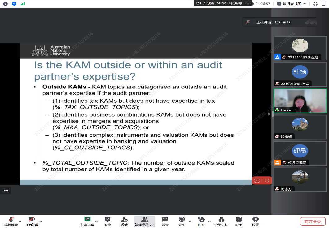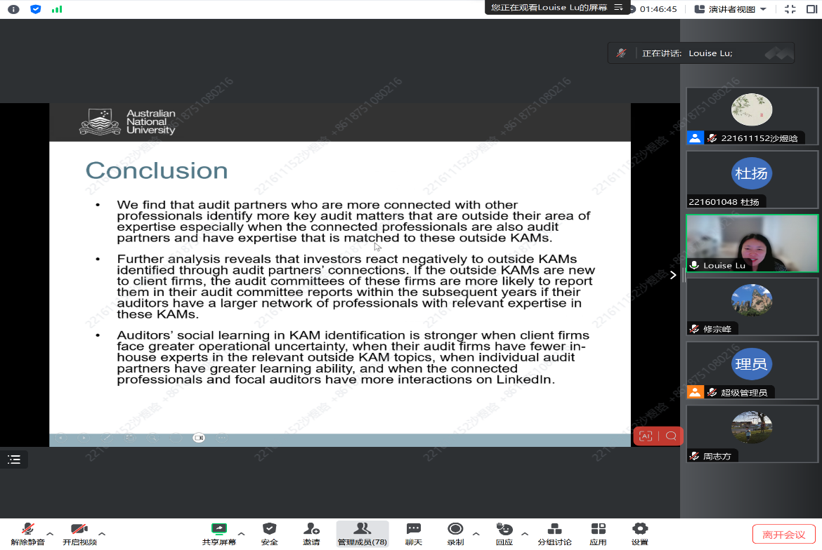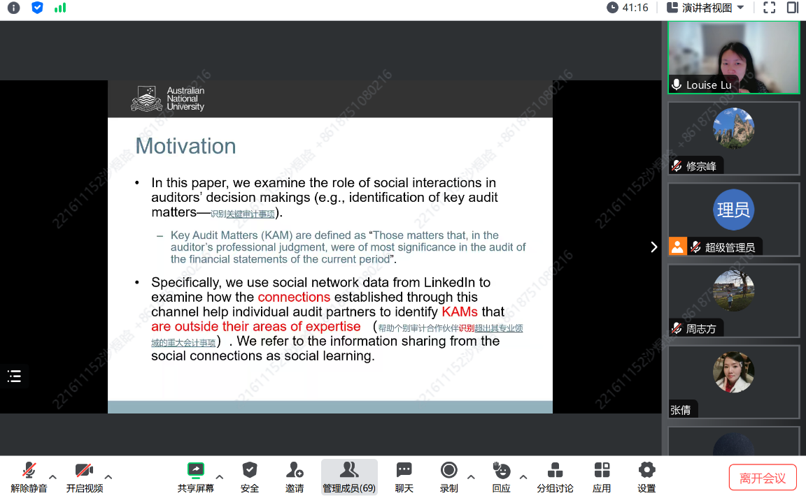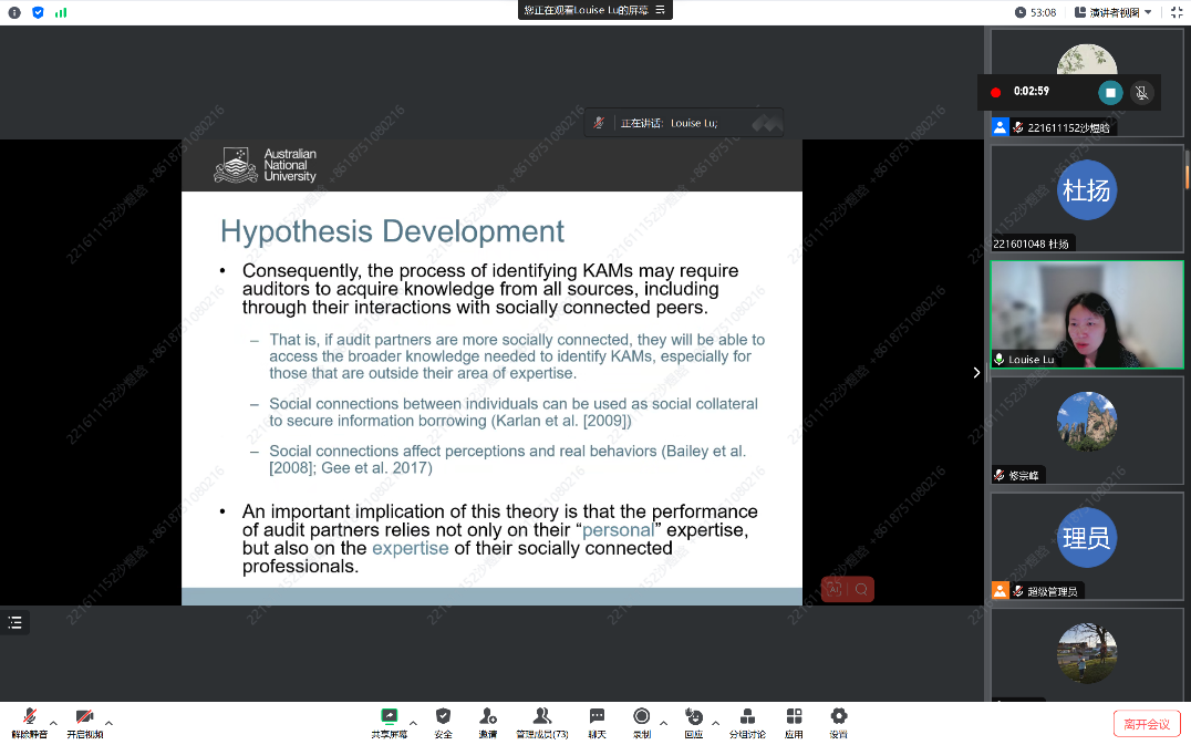 2023年6月12日上午,澳大利亚国立大学Louise Yi Lu 教授应邀做客星空XKXK星空体育经管学术论坛第238期,为星空官网师生带来了题为Social Learning in Auditing的线上讲座。本次讲座由星空XKXK星空体育周志方教授主持,XK星空体育修宗峰副教授、易玄副教授、李香花副教授、曾辉祥副教授、澳大利亚格里菲斯大学胡方副教授等老师及学院各年级研究生参与本次讲座。