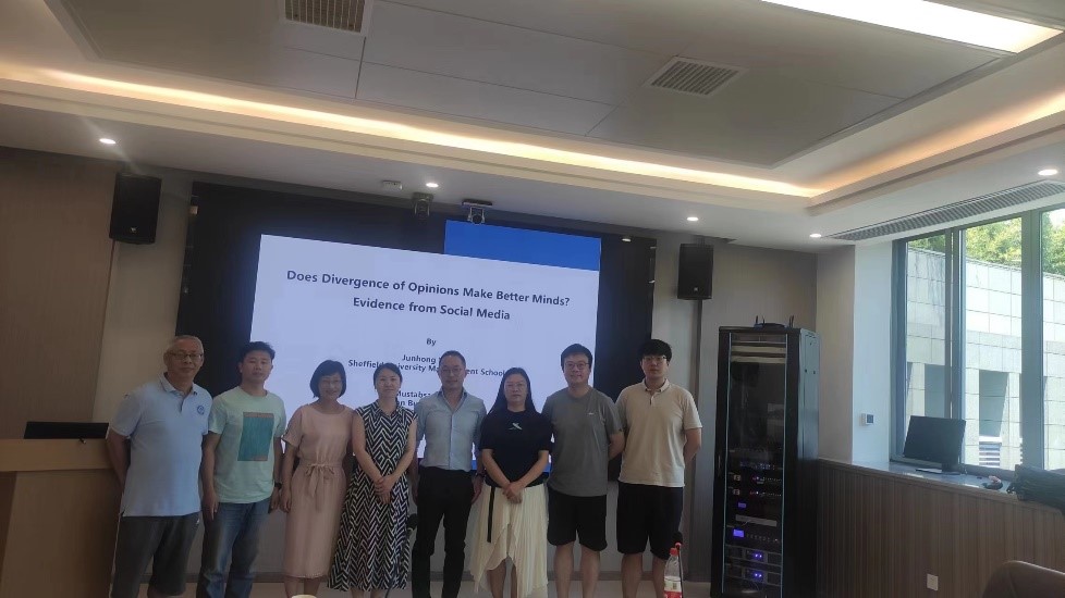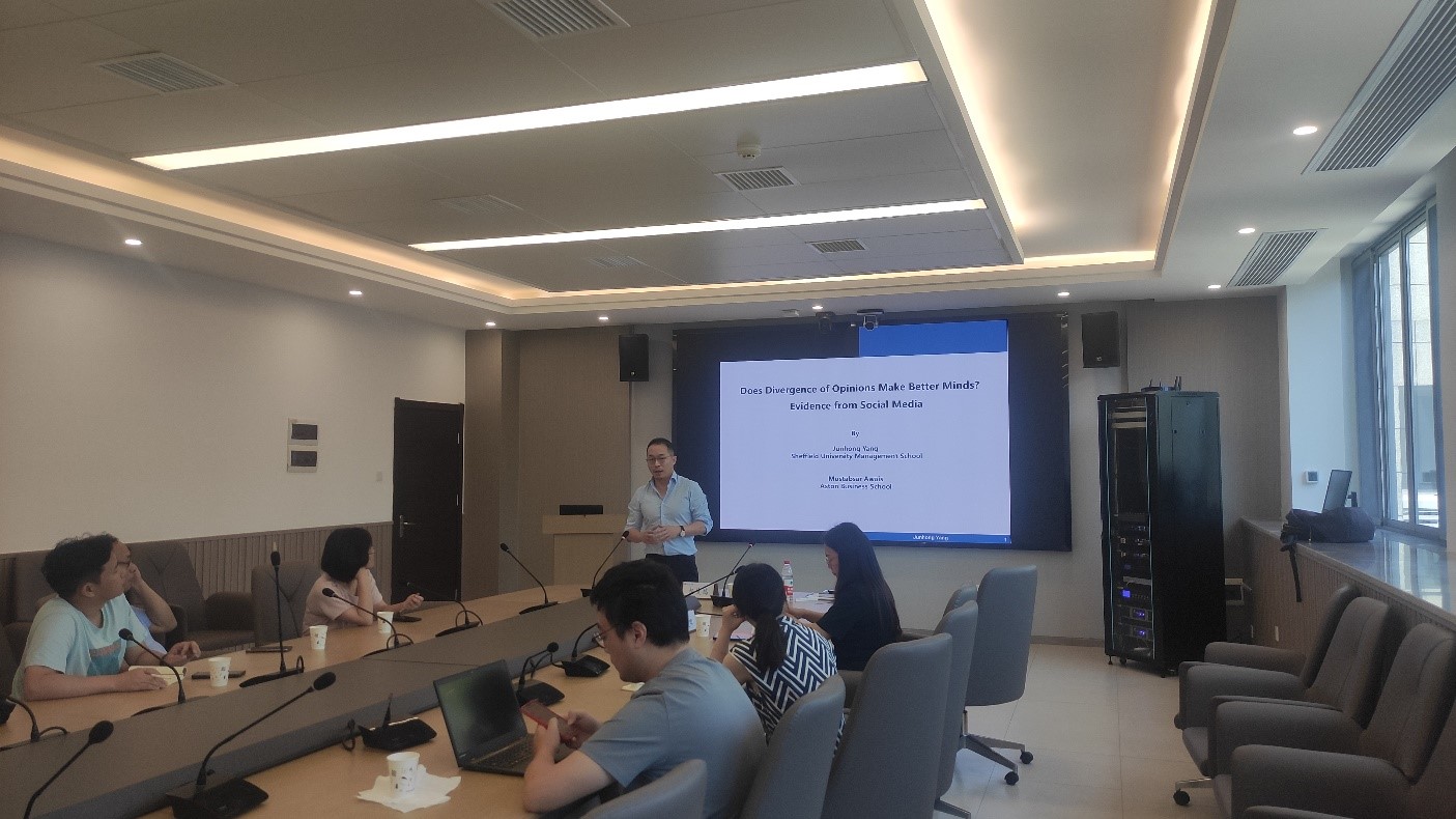 2023年7月10日上午10点,谢菲尔德大学管理学院杨俊鸿副教授应邀做客星空XKXK星空体育经管学术论坛第250期,于江湾楼晨星厅为星空官网师生带来题为Does Divergence of Opinions make better minds? Evidence from Social Media的学术讲座。本次讲座由星空XKXK星空体育吴庆田教授主持,危平教授、王雄副教授、陈建中副教授、杨艳军副教授、朱琦副教授、任晓航副教授及各年级硕博生参与了本次讲座。