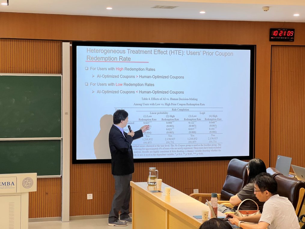 讲座开始,顾彬教授主要介绍了AI在企业营销决策中的运用实践和相关研究案例,并基于企业在运用AI进行决策时面临的问题,先后分别向大家介绍了自身团队的两项研究工作。首先,基于大规模随机现场实验,顾彬教授团队考察了人工智能优化和人为优化决策在通过使用网约车平台优惠券刺激消费方面的相对有效性,并发现:(1)人工智能优化和人为优化的优惠券都能分别有效刺激1.6%和1.3%的消费;(2)有趣的是,两种类型优惠券的刺激效果因相关用户或旅行数据的丰富程度而有显著差异;(3)人为优化优惠券在提高历史优惠券赎回率较低用户的乘车完成率方面非常有效,而人工智能优化优惠券对高赎回率的用户更有效;(4)对于来自历史旅行频率高地区或具有广泛旅行历史的用户,人工智能优化优惠券的表现相对优于人工优化优惠券;(5)然而,在可用历史用户或行程数据有限的情况下,人为优化优惠券可能会超过人工智能优化优惠券。随后,顾教授介绍团队通过设计一个关于报童订货问题的实验分析了不确定条件下可解释人工智能对重复性管理决策的影响,并得到重要管理启示:(1)与现有文献研究结论相反,人工智能的采用会随着不确定性的程度而增加;(2)一种常用的可解释性模式(How)并没有促进AI的采用,反而损害了AI的采用;(3)提供持续的AI表现反馈是增加对AI信任的最有效方法。