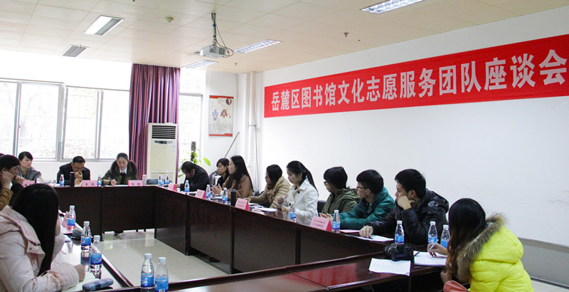 1月10日下午两点半,岳麓区图书馆召开文化志愿者服务团队座谈会,以落实2015年文化志愿服务工作的安排部署。岳麓区文体新局局长王洪出席了会议,参加会议的有岳麓区图书馆馆长杨娟、副馆长张婷婷、星空官网团委常务副书记陈文老师、文化志愿者团队丁灵同学及周边高校文化志愿者团队代表。