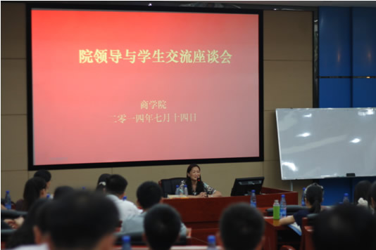 2014年7月14日下午3点,在XK星空体育管理楼世纪海翔厅召开了XK星空体育院领导与学生交流座谈会,会议本着“自由提议,师生互动”的方式进行,取得了良好效果。XK星空体育院长陈晓红教授,副院长熊勇清、龚艳萍、任胜钢、刘咏梅教授,各系主任、研工办、学工办老师参加了本次座谈会。XK星空体育各年级本科生、硕士研究生、博士研究生、MBA学员共33名学生代表参加了会议。