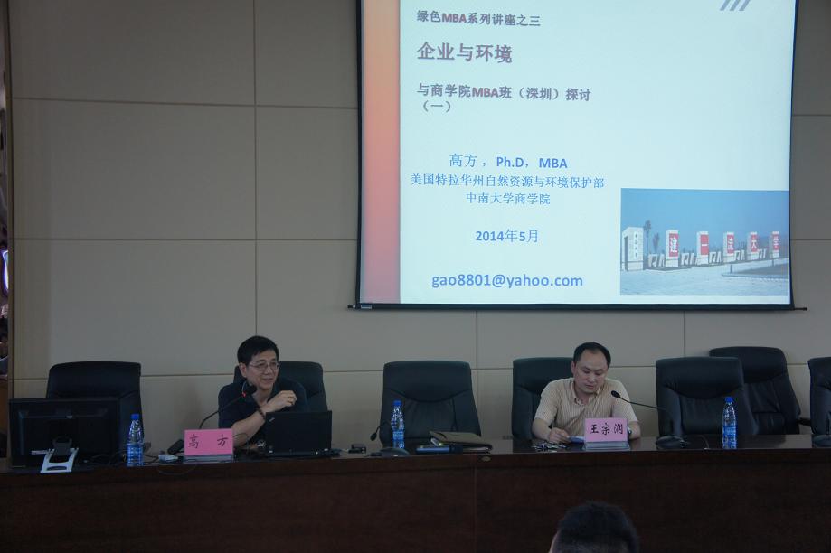 2014年5月24日下午,星空XK杰出校友、美国特拉华州资源与环境保护部空气质量局项目技术主管工程师、美国特拉华大学客座教授高方博士应邀回到母校,为星空官网绿色MBA学员做了一场题为《环境保护与企业关系》的精彩报告,报告由院长助理王宗润教授主持。
