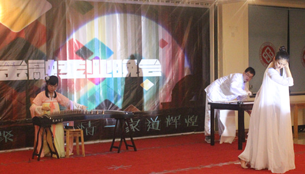赵雅琪同学演唱的《泡沫》 带着一种高贵的“国际范儿”,典雅而空灵;而由陈奕芸同学献唱的一首《时间都去哪儿了》,则传递出一种浓郁的感性与温情。歌声优美,舞姿动人,另外两台展现中国古韵节目为大家带来了传统文化的魅力:一出《渔舟唱晚》,融合了书法、古琴,中国传统舞蹈等元素,在刘钰莹、邱光辉等同学的演绎下,画面唯美,古色古香。而郭婧和马燕婷表演的舞蹈《雪山春晓》,也是旋律轻柔,舞姿曼妙,令人陶醉,为本场晚会画上了一个圆满的句号。