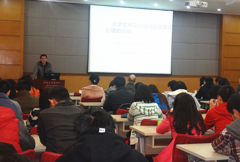 接着由唐海波教授为在场同学做详细的心理指导。唐海波教授通过一个总裁的事例,从两个方面说明心理健康的重要性,成功地吸引了在场同学的注意力。其一,大学生心理异常的识别原则及心理异常的表现;其二,大学生常见心理问题。在对这两个方面的讲解中,唐教授旁征博引,娓娓道来。在场的同学们无不全神贯注,认真听讲。如在讲到常见心理异常表现之精神症状方面时,唐教授就地取材,以具体事例为例,由浅入深,层层剖析,在场同学均表示受益匪浅。
