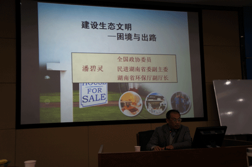 潘碧灵厅长与大家一起探讨了建设生态文明的困境与出路。他指出,生态文明是新的文明观、发展观、环保观、制度观,保护、改善生态环境就是保护和发展生产力。生态文明建设内容主要包括生态文明建设体系和生态文明评价体系两方面。形成生态文明社会需要建设发达的生态经济,一要生态产业化,二要产业生态化,三要产业高端化。他还总结了绿色发展、循环发展、低碳发展、协调发展、集约发展、清洁发展等十余种生态经济发展模式。