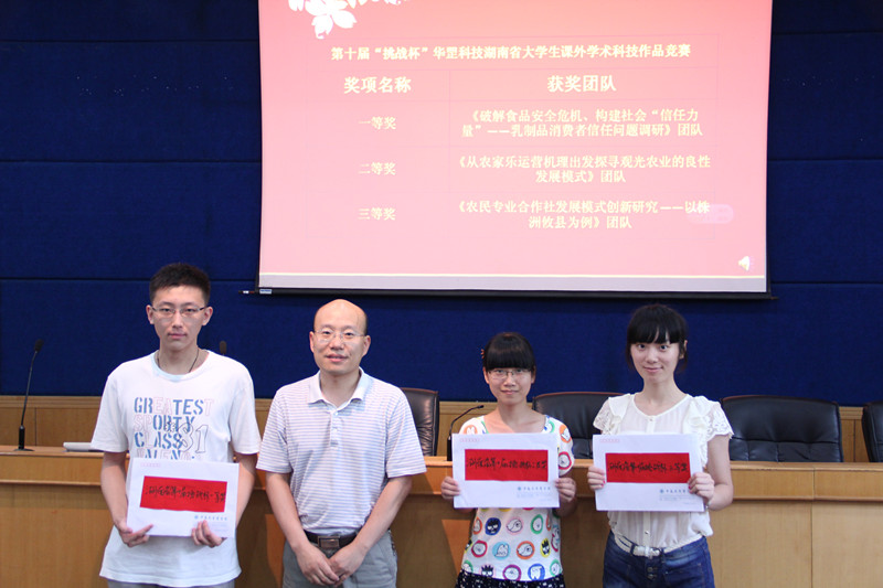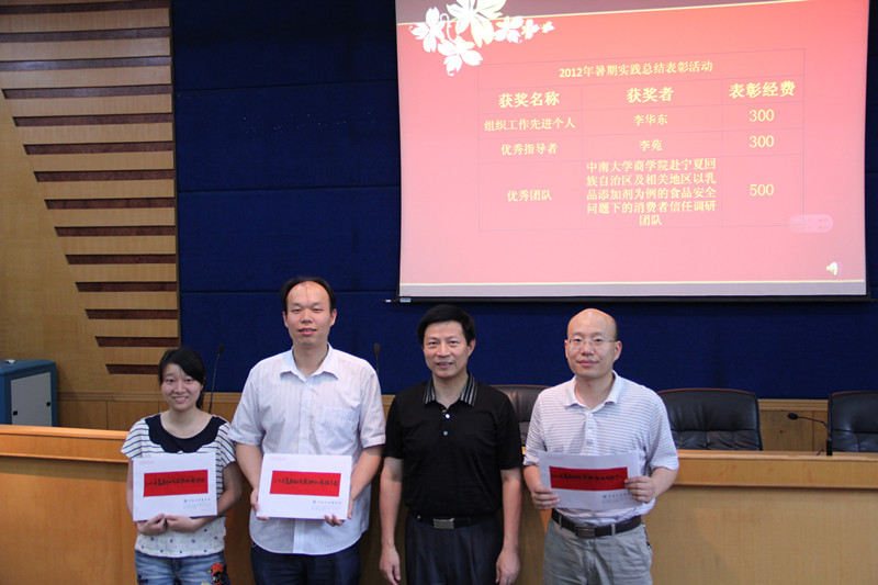 随后,院领导、老师对获奖的老师和同学进行了表彰。在2012年暑期实践活动中,李华东老师获“组织工作先进个人”荣誉,李苑老师获“优秀指导者”荣誉,《星空XKXK星空体育赴宁夏回族自治区及相关地区以乳品添加剂为例的食品安全问题下的消费者信任调研》团队获“优秀团队”奖项。在第十届“挑战杯”华罡科技湖南省大学生课外学术科技作品竞赛中,星空官网三支参赛队伍《破解食品安全危机、构建社会“信任力量”——乳制品消费者信任问题调研》团队、《农家乐运营机理出发探寻观光农业的良性发展》团队、《农民专业合作社发展模式创新研究——以株洲攸县为例》团队分别荣获省一、二、三等奖。在2013星空XK“青春行,中国梦”万人调研湖南暑期社会实践活动中,XK星空体育也涌现了一批优秀项目。其中,院级立项A级10个团队,B级20个团队,C级30个团队,D级53个团队。