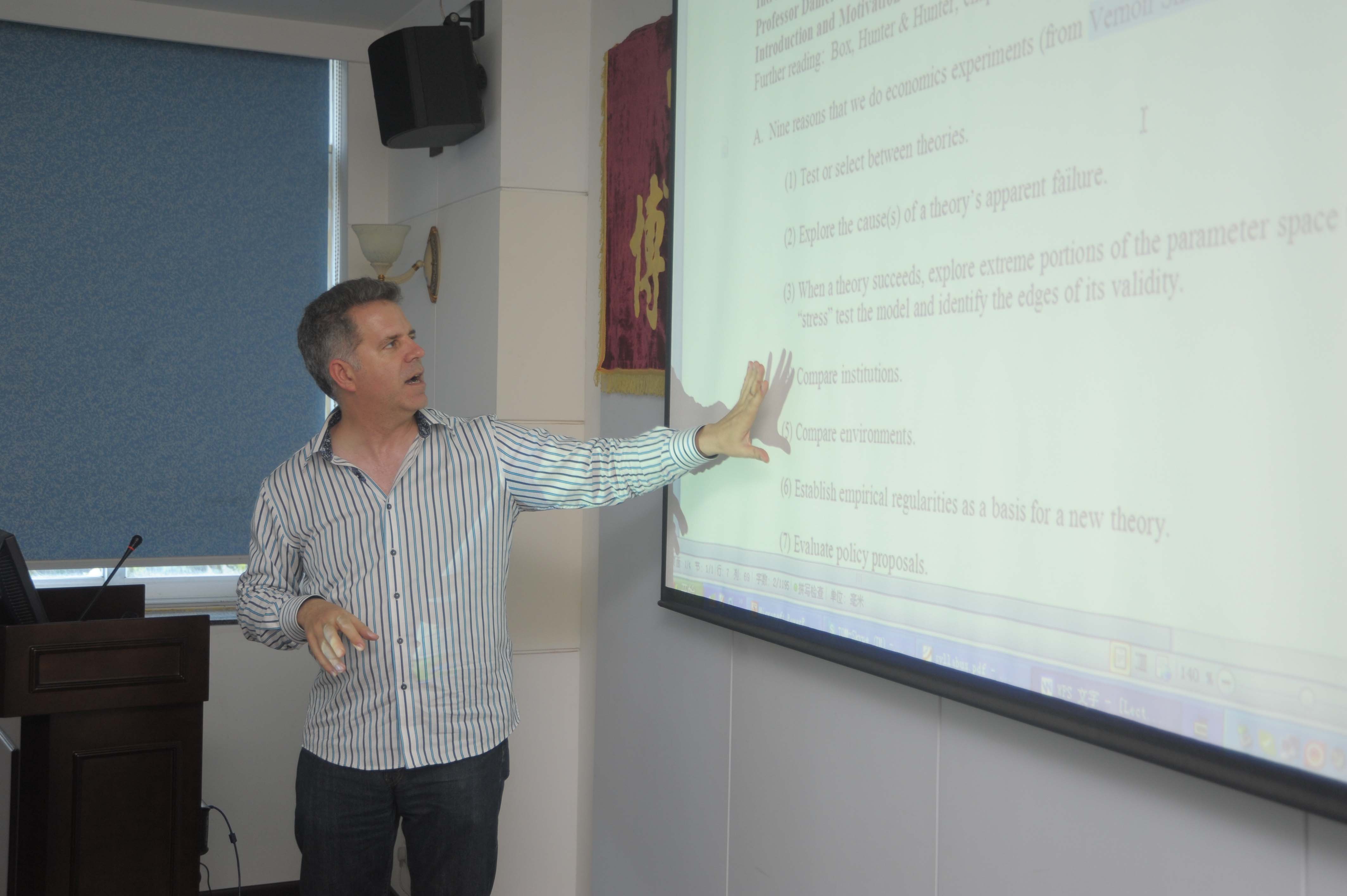 围绕人文社科专业“如何将行为科学实验导入到教学中”的主题,国内外5位专家学者分别进行了讲解。美国乔治梅森大学经济系主任Daniel Houser 教授展开了大会的第一个演讲教程,演讲题目为“Introduction to Design and Analysis of Economics Experiments”,报告围绕《实验经济学》课程展开,针对实验设计与分析教学进行了系统性介绍,重点讲述了行为科学实验的九大用途、实验设计和实验分析等。