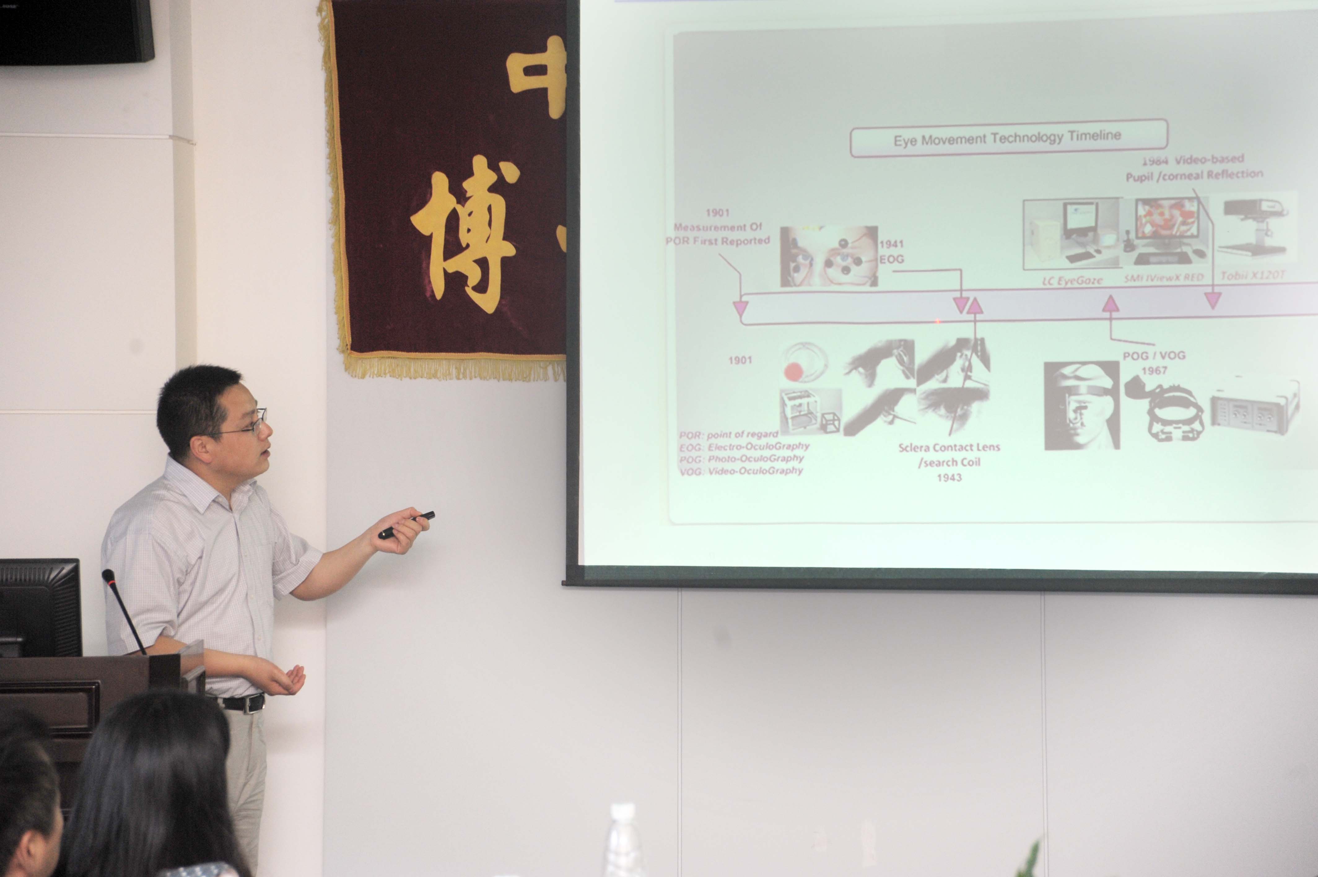 随后,天津师范大学心理与行为研究院的杨海波副教授做了题为“眼动追踪技术在商业领域的应用:方法与案例”的报告。从眼动追踪的基础知识、发展趋势和应用领域出发,以“平面广告背景特征对产品注意加工的影响”为案例,逐步阐述了被试选择、研究方法、实验程序、施测、数据处理的详细实验过程。杨教授针对广告营销中的眼动教学,为与会师生提供了眼动教学示范。
