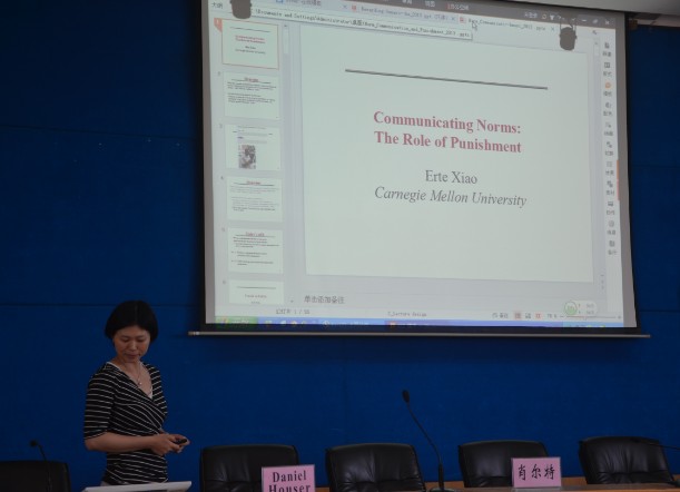 接下来肖尔特教授主讲了“Communicating Norms: The Role of Punishment”,第一部分讲述“公开实施处罚促使人们遵守规范”,第二部分讲述“盈利性处罚腐蚀人们遵守规范”。在题为“Punish in Public”的第一篇论文中,实验了弱公开处罚的实施对提高惩罚有效性的促进作用并提出这一实验结果可以解释现有的制度并为制度设计提供参考。为探求盈利性处罚对人们遵守规范情况的影响,第二篇论文匠心独运地设计出“Sender-Receiver Game”的实验,结果显示当惩罚者从惩罚行为中获利时,人们会认为他们的行为并未违反相关规范,因而惩罚并没有起到应有的作用。报告最后的互动环节,肖老师对同学们的提问一一进行了解答。