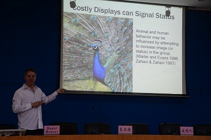 Daniel Houser教授首先进行了题为“Competition for Trophies Triggers Male Generosity”的报告。报告从原始部落狩猎的合作精神出发,由浅入深介绍了“争夺奖杯能触发男性慷慨”的主题。为探索“争夺奖杯”与“慷慨”之间的关系,Daniel Houser教授进行了严谨的实验设计,比较了被试者对不同奖励(即独特持久的奖励、同等价值的非独特持久的奖励)所做出的不同反应以及被试者性别上的行为差异,得出奖杯的寻求偏好可以改善男性慷慨、促进人类合作的结论。报告期间,Daniel Houser教授的缜密思维、自信与活力感染了在座的观众,学院老师和同学踊跃发言,与Daniel Houser教授进行了良好的互动。