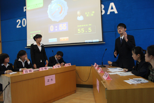 在放映了两支队伍各具特色的宣传短片后,比赛正式开始。此次辩论围绕 “城市公共运输系统应该以盈利为主还是以公益为主”的辩题展开,正方管理1206班一辩立论:公共运输系统的盈利性能更好的满足公众与企业的双向需求,并非加重人民经济负担。同时,公共运输系统的盈利将促进资金回笼与流通,使系统的设备、建设得到提高,行业得到发展,做到先盈利后公益,最终将呈现国家、企业与人民共赢的美好局面。反方混合联队一辩则从容不迫地对正方进行反驳并立论,他强调了公益的纯洁性,表示公共运输系统的初衷是服务大众而非盈利,而盈利只是维持这个系统自身造血的一个辅助手段,人民的需求得到满足,社会的生产效率自然会提高,此时将创造出更大的利益。