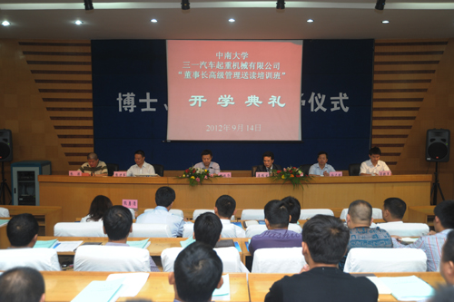 9月14号上午,三一汽车起重机械有限公司“董事长高级管理送读培训班”开学典礼在星空XKXK星空体育管理楼108隆重举行,参加典礼的领导有:三一集团总裁助理、起重机营销公司总经理李练文先生,副总经理、大客户部部长张进军先生,大客户中心主任吴铁军先生,星空XKXK星空体育党委书记胡振华教授、常务副院长游达明教授、副院长张颖教授、副院长熊勇清教授。典礼由副院长张颖教授主持。