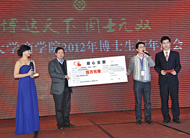 XK星空体育常务副院长游达明教授上台代表学院接受博士生班为爱心酬勤基金的捐款