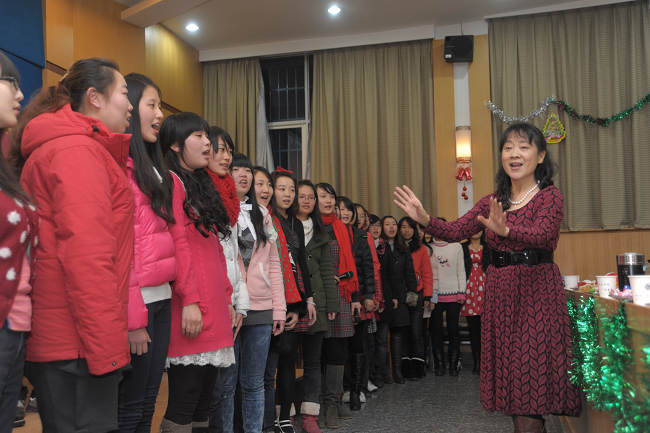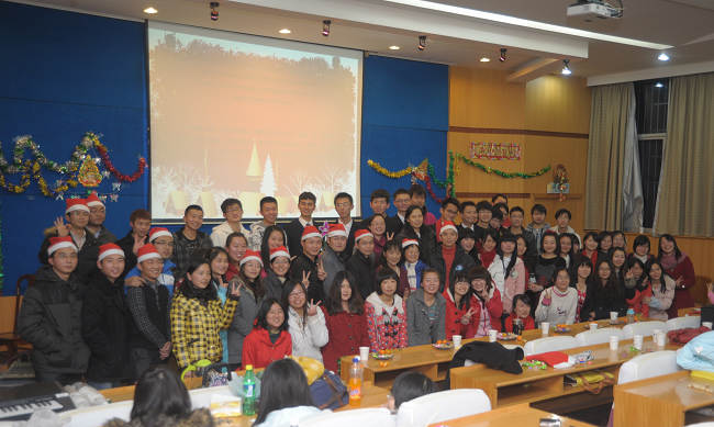 在四位同学用英文朗诵娓娓道来耶稣诞生的故事之后,圣诞颂歌大合唱隆重上场,在王咏梅老师优雅的指挥下,09级国贸和金融专业的同学们为观众带来了精彩的演唱。《Joy to the World》 点燃全场的欢快气氛,随后《平安夜》(Silent Night)、《Angles We Have Heard on High》等歌曲满载着温馨而来,最后以 《We wish you a merry Christmas》这首欢快的童谣作结,全场处处都洋溢着快乐和祥和。合唱过后,在''Merry Chrismas"的祝福声中各位全体师生合照留念,记录下这一刻的所有欢欣和美好!