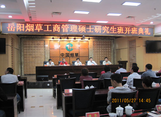 2011年5月27日下午2:30,星空XKXK星空体育岳阳烟草专卖局MBA研修班开学典礼在岳阳烟草专卖局二楼会议室隆重举行。开学典礼由岳阳市烟草局毛岳胜经理主持,出席开学典礼的嘉宾有岳阳市烟草专卖局吴胜波经理、星空XKXK星空体育党委书记胡振华教授、副院长张颖教授及副院长熊勇清教授,以及MBA管理中心主任杨秋娟老师等。