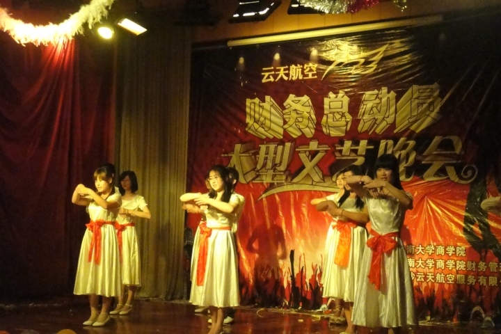清新甜美的舞蹈《honey》、幽默风趣的话剧《包拯》、挑战经典的小品《胡椒面》、温馨感人的《爱的华尔兹》不断的将惊喜带给观众。一阵阵掌声过后,《还珠格格系列》将观众的记忆拉回了童年,当熟悉的旋律弥漫整个会场时,大家不由自主地一起清唱了起来。一段段精美或火爆的舞蹈,一幕幕精彩或诙谐的话剧点燃了会场的激情,激动的呐喊,尽情的欢呼无不彰显着青春的活力。振奋人心的《武术表演》、财务兄弟演唱的《单身情歌》、无声胜有声的《爱,因为在心中》手语表演更是将晚会的氛围推到了高潮。晚会中还设定了嘉宾演唱环节,特别邀请了专业歌手刘明敏、尹瑞芝献唱,让大家徜徉在音乐的海洋。当老师们一起高歌那首熟悉的《康定情歌》时台下的掌声就未曾间断过。别出心裁的“师生数钱大PK”游戏使在场师生们捧腹大笑。
