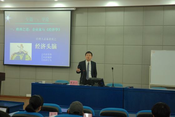 戴亦一教授首先引用了萨缪尔森经典著作《经济学》里面的一段话:“骑士制度的时代已经过去,随之而来的是诡辩者、经济学家和计算机的时代”阐释了经济学对于当今社会的重要性。随后,他又结合实际,强调了当代企业家学习经济学的必要性、必备的经济头脑以及企业家如何像经济学家那样思考现实问题。