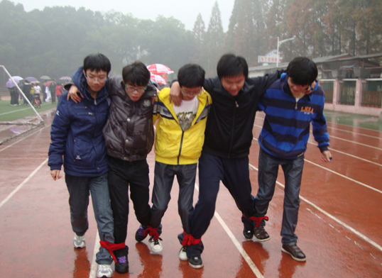 当日早晨7点30分 ,全体参赛选手冒着细雨准时来到校本部体育场集合,在明确比赛规则与流程后,各个小组斗志昂扬蓄势待发,并有序进行赛前准备活动。比赛开始,各队首先完成猜字谜、五人六足和跳大绳的趣味环节。为了提高效率,做到分工合理,突出男女合作能力,在每队的5名女同学完成两道猜字谜题目的同时,男队员用红绸带绑上脚,伴随着有节奏的口令向前进发。男女队员均完成各自任务后,到达集体跳绳环节点,全队参加跳大绳项目,顺利跳10次方可进入下一环节。这些趣味活动的展开旨在培养队友间的默契和增强同学间的凝聚力。