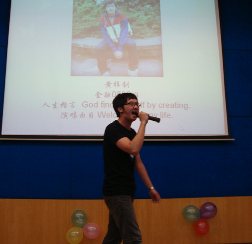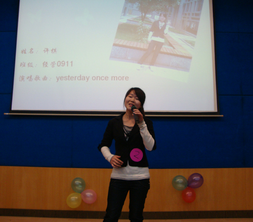 晚会伊始,由宋航带来一首close to you为比赛助兴,美妙的歌声令人沉醉,大家立刻感受到异国文化的别样风情。比赛开始,选手分别播放了自我介绍短片以及亲友团加油助威短片,一幕幕温馨的画面、一句句真诚的话语,“加油!我们支持你!”美好的祝福来自父母、老师以及同学、室友,现场处处流露着感动。演讲环节,6号郭林杰的演讲“Our future”令人热血沸腾,道出了大学生追求美好明天的勇气和信心。英文歌比拼则将现场推向了高潮,10号黄梓钊一曲“Welcome To My Life”活力四射,充满青春的气息,“To Be Left Out In The Dark”唱出了年轻一代的无谓与不羁;7号李果也不示弱,一曲“Just One Last Dance”甜美的声音久久回荡在大家耳畔,“Before We Say Goodbye”淋漓尽致地诠释了爱情;11号的易孜技高一筹,一曲《my heart will go on》让大家沉醉到泰坦尼克号那段荡气回肠的爱情之中不能自拔,最终获得了歌曲组的冠军。英文电影配音环节,各段配音惟妙惟肖,精彩绝伦,听到5号张行方的配音“Harry Potter”,大家仿佛置身于亦真亦幻的魔法王国。
