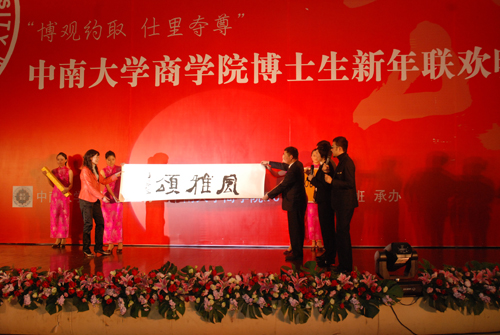 中国国家画院书法院常务副院长、中国书法家协会理事、著名书法家曾来德先生也为XK星空体育博士生论坛暨新年酒会泼墨,题了“风 雅 颂”三字,现场举办了馈赠仪式,XK星空体育院长陈晓红教授、党委书记胡振华教授代表学院接受了曾先生的礼物,并感谢曾先生对XK星空体育的支持。