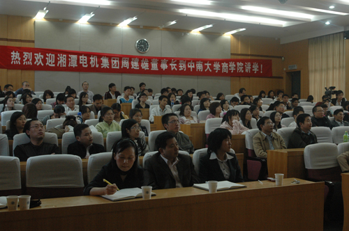 众所周知,能源将成为21世纪的主要问题,如何解决能源问题已是世界性的课题,周董还向大家展示了湘电集团在风能研发方面所取得巨大成果,其研制的风力永磁发电机掌握了六大核心技术,居世界领先水平,尤其是其在海上风电研究方面已突破世界性难题,令大家叹为观止。回顾湘电集团的发展历程,周董寄语在座的师生“强者为理想而奋斗,弱者为舆论所左右,永远不要听信那些习惯消极看问题人的话,他们只会粉碎你的梦想,要相信你一定能做到”。