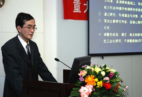 在“中部崛起过程中的新型工业化研究”项目开题报告会中。陈晓红教授作为课题组首席专家代表课题组作了主题报告。报告分为八个部分:课题研究意义和价值、国内外研究现状评述、研究思路与研究方法、课题研究内容设计、拟突破的重点、难点与创新点、课题分工及主要成员、专家意见反馈及说明、研究计划、预期成果。各子课题负责人分别从不同的角度汇报了各自的内容。与会专家纷纷就课题的相关内容尤其是需要创新的理论问题等发表意见、提出建议。专家组认为如能按照评审书要求完成任务并产出相应成果,将对我国的新型工业化进程和中部崛起战略的推进起到理论指导和经验总结的作用,是一项既有理论创新又有实践指导意义的研究。张东刚副司长在总结讲话中提出尤其要注意从以下三个方面加强课题研究:一是坚持课题研究与理论创新相结合;二是从技术进步与制度创新的内在关系上开展研究;三是从经济区域与行政区域的矛盾上展开研究。张东刚副司长希望通过课题研究能与资政相结合、与社会服务紧密结合、推出有创新的政策建议,加速研究成果向社会生产力的转化,希望通过组织课题研究实现项目管理创新。
