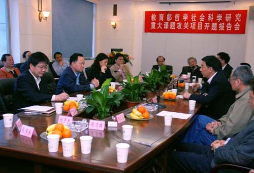 4月19日下午,由教育部组织的教育部哲学社会科学研究重大课题攻关项目开题报告会在管理楼召开。教育部社科司副司长张东刚教授、规划处处长徐青森教授、成果处副处长王日春教授等出席会议。副校长邱冠周教授出席会议并致词。会议由人文社科处处长王国顺教授主持。项目组专家、人文社科处以及课题组成员参加了开题报告会。