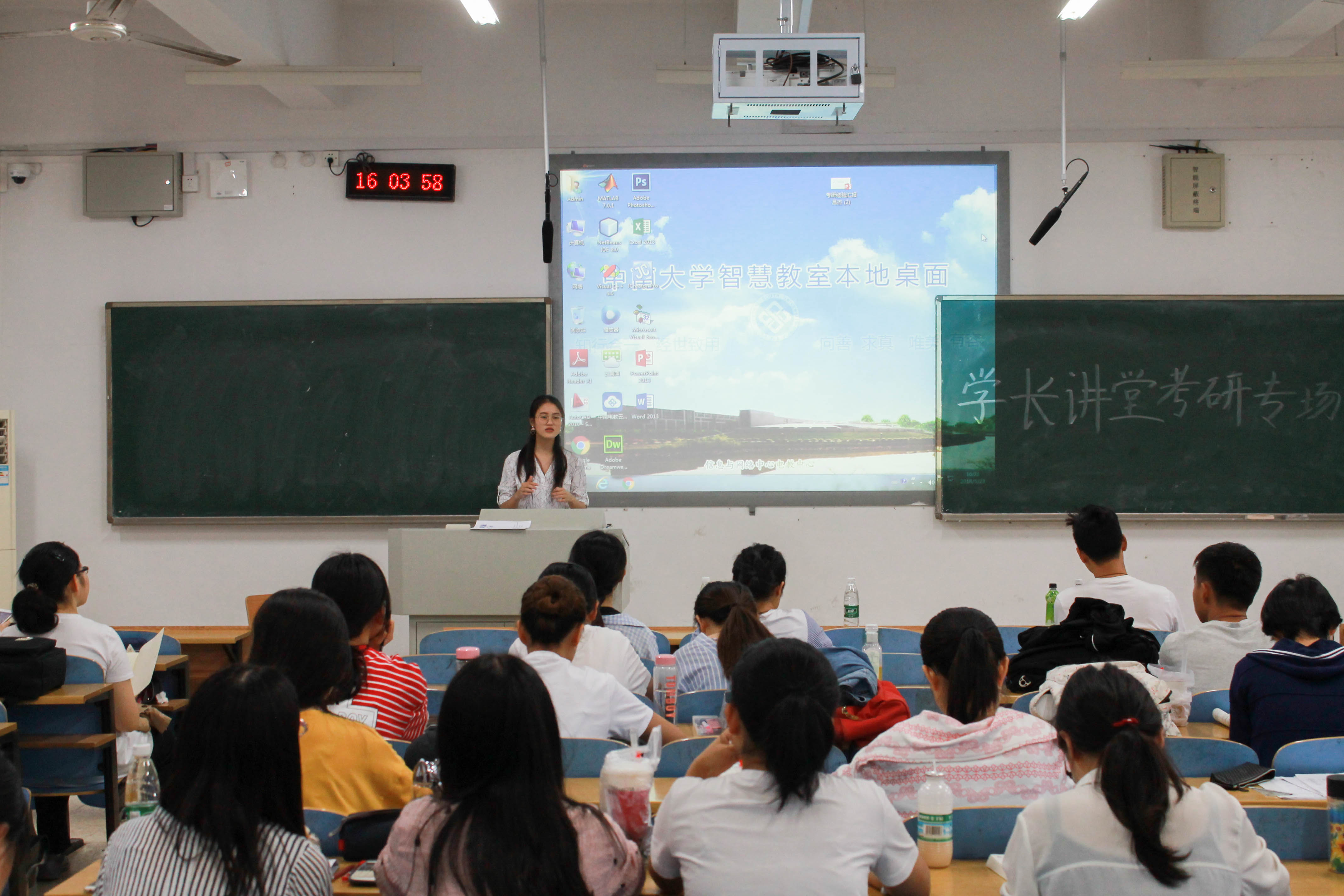 “考研经验分享”专场于5月23日下午在B座205教室成功举行。本次活动由来自14级信息管理与信息系统专业的吕杰同学和来自14级国际经济与国际贸易专业的江恺姣同学主讲。江恺姣同学她结合自己的心路历程着重讲解了考研过程中对于课外辅导课程如何选择和考研过程中的心态调整问题,并且强调在考研过程中目标一定要坚定。吕杰同学提到如果有志同道合的“研友”共同准备考研,不仅可以互相监督,而且对彼此的促进作用很大。