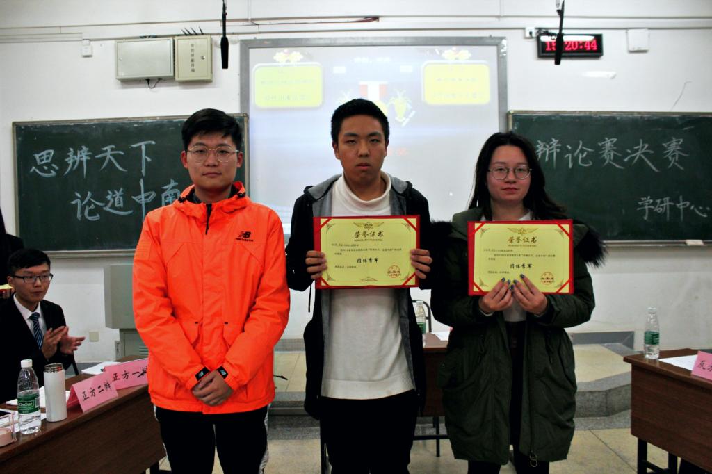 经过各位评委和观众评分,“我们都是奇葩队”以92.25分拔得头筹,“优秀”战队四辩颜泉润获得“最佳辩手”称号。三位老师分别为冠亚军队伍和最佳辩手颁发证书,并合影留念。至此,为期一个多月的辩论赛圆满落幕。