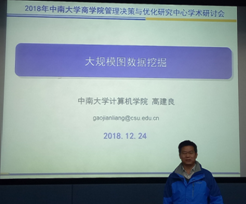 随后,高建良副教授,做了大规模图数据挖掘的主题学术报告。高建良老师以社交网络、生物网络、物联网三个领域为研究背景,分别介绍了大规模图数据挖掘的相关研究进展,讨论了大规模图数据挖掘在金融、舆情、医疗等领域的应用价值。此外,高建良老师还和周艳菊教授、张红宇副教授就实施大数据研究的技术手段、大数据预测中的可解释性等问题做了深入的讨论。