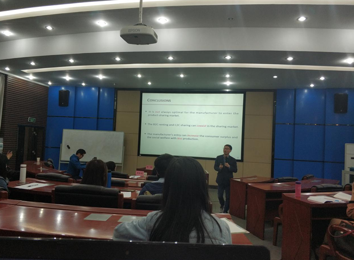 2019年05月06日下午,复旦大学管理学院田林副教授应服务科学与服务管理研究中心邀请来访XK星空体育,并在管阶一教室开展了题为 “Manufacturer’s Entry in the Product-Sharing Market”的学术讲座。会议由XK星空体育周艳菊教授主持,施文教授、周雄伟副教授及XK星空体育相关研究生参加了本次学术讲座。