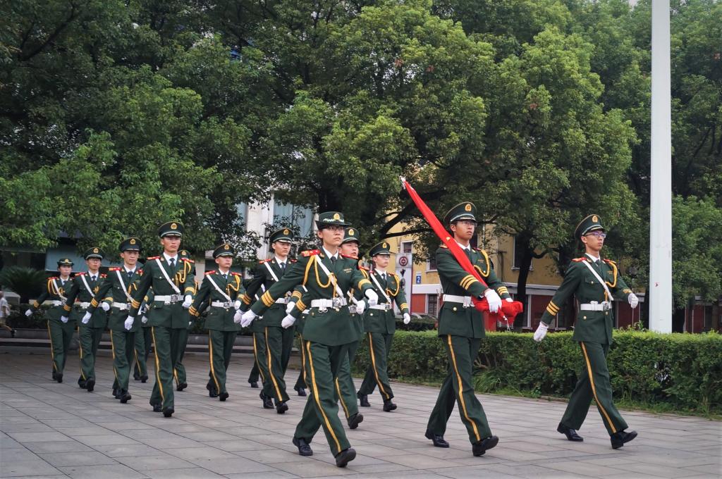 整洁的礼服,挺拔的身姿,有力的步伐,伴随着《义勇军进行曲》雄壮的旋律,擎旗手稳稳擎着国旗,带领整个方阵庄严进场。