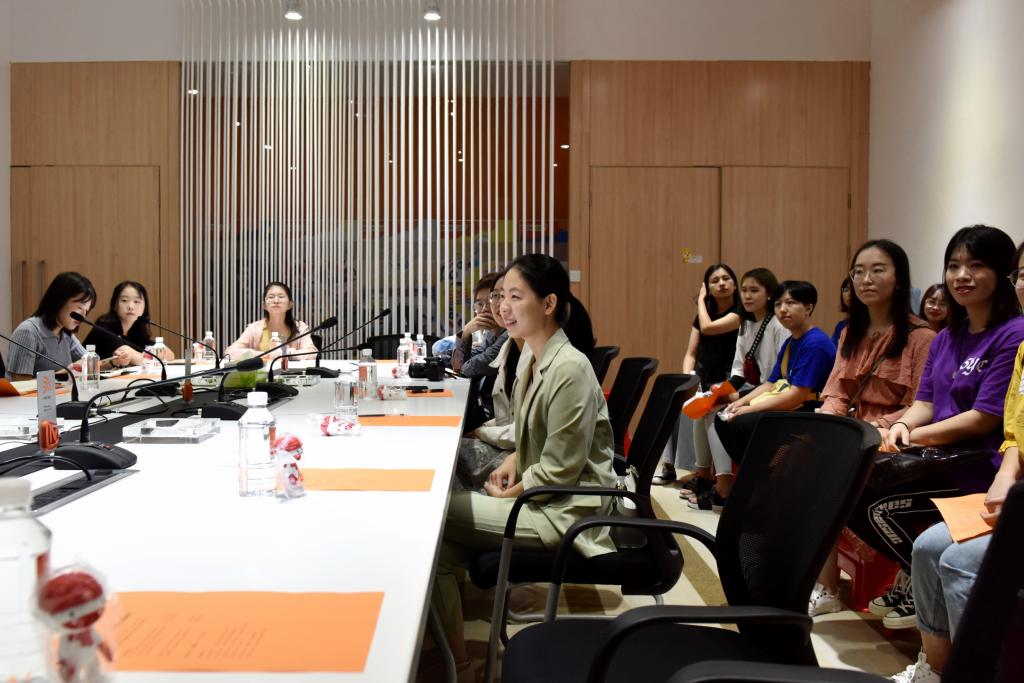 接下来,双方就企业介绍及发展进行了交流。刘珈羽女士向代表团介绍了芒果TV的发展历程、主打IP综艺产品、企业发展趋势与目标、企业成就,以及针对实习生开展的例如“青芒计划”、“大芒计划”等多项内容。她提到,芒果TV肩负着建设新型主流媒体的时代使命,构建芒果TV生态矩阵,形成内环外环良性发展,并积极创新探索,打造具有年轻活力的企业品牌。随后,来自星空XK建艺院、公共管理院、自动化学院的四位参加了“青芒计划”的同学和代表团分享了在芒果TV工作的经验与感受。代表团的各位同学也积极参与到讨论中,提出了一些有关实习生及秋招计划的问题,芒果TV工作人员做出了详细的解答。