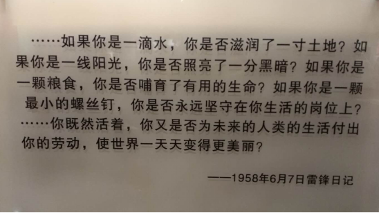 “如果你是一滴水,你是否滋润了一寸土地?如果你是一线阳光……”这是大家接下来参观雷锋纪念馆时,在雷锋日记中看到的文字,虽然雷锋已经远离我们而去,但雷锋精神确依然留在我们的心中。在当今社会,特别是年轻一代部分呈现出浮躁风气的时候,更需要像雷锋一样,有着对自己事业执着和锲而不舍的追求,我们更需要弘扬雷锋精神!